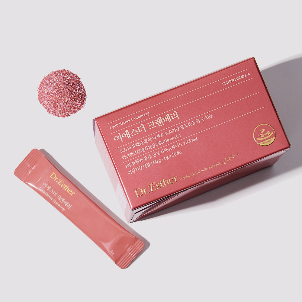 1. 북미산 크랜베리 추출물 100% 함유 1) 원료의 약 34배 농도의 고농축 크랜베리 추출물 2) 미국 특허 바이오쉴드 공법 적용 : 크랜베리 전체의 유효성분인 꿀, 과육, 과피, 씨앗 등을 안정화 시키는 기술 2. 식품의약품안전처에서 인정한 요로건강 개별인정 원료인 크랜맥스 500mg 함유 지표 : 총 안토시아노사이드 1.25mg 함유 → 요로 세포벽에 서식하는 유해균의 흡착을 방해하고, 유해균을 요로를 통해 배출하는 데 도움이 되는 성분 3. 크랜베리 추출물은 인체 적용 시험을 통해 효과가 입증됨 1) 실험대상자 : 94명(크랜베리 섭취군 47명, 대조군 47명) 2) 시험방법 : 위약 또는 크랜베리 6개월 복용, 추출물 500mg을 1일 2회 섭취 3) 결과: 크랜베리 섭취는 대조군에 비해 요로감염을 약 70% 감소시켰습니다. ※ 인체적용시험 결과는 모든 사람에게 적용되지 않습니다. 4. Dr. LYUH Esther의 재료 혼합 노하우 - LYUH Esther 박사: 서울대학교 의과대학 예방의학 박사, 가정의학 전문의 5. 하위소재 8개 포함 : 락티카 자바실러스 람노수스, 치커리 뿌리 추출물, 갈락토올리고당, 비타민 C, 비타민 E, 아연, 프로폴리스 추출물 분말, 난소 말토덱스트린 6. 1일 1포, 언제든지 간편하게 섭취 가능한 개별 포장 |