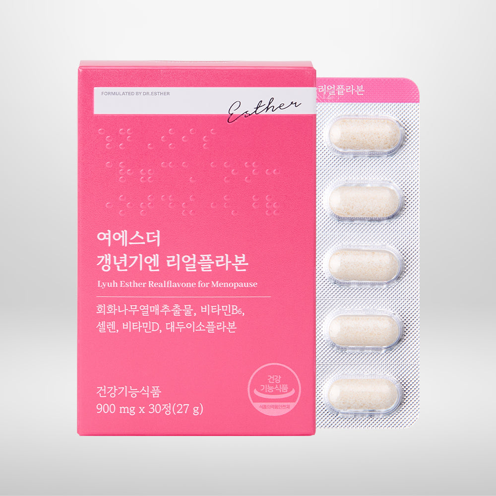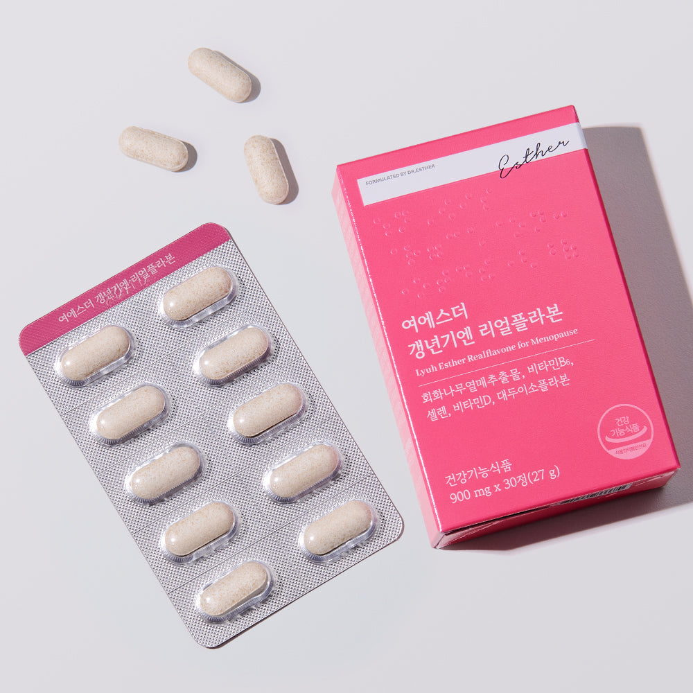 - Approved by the Korean Ministry of Food and Drug Safety for its function in supporting menopausal women's health - Contains 350 mg of Sophora japonica fruit extract per day (providing 43.75 mg of sophoricoside) 2. Includes various essential ingredients to help prevent menopausal symptoms in middle-aged women - Soy isoflavones: Aglycone-type soy isoflavones for enhanced absorption and women’s health benefits - Contains 25 mg of soy isoflavones to help support bone health - Vitamin D: 10 µg to help reduce the risk of osteoporosis - Vitamin B6: 1 mg to help maintain normal blood homocysteine levels - Selenium: 55 mcg to help protect cells from oxidative stress 3. Formulated with additional ingredients to help support menopause - Contains GABA for those experiencing sleep disturbances associated with menopause - Includes Vitamin K2, which helps regulate calcium metabolism 4. Dr. Lyuh Esther’s expertise in ingredient formulation - Dr. Lyuh Esther: PhD in Preventive Medicine from Seoul National University, Family Medicine Specialist - Developed with consideration of Asian body constitution and health needs 5. Easy menopausal health care with just 2 tablets a day - One daily serving (2 tablets) provides key and supportive ingredients to help support menopausal women’s health |