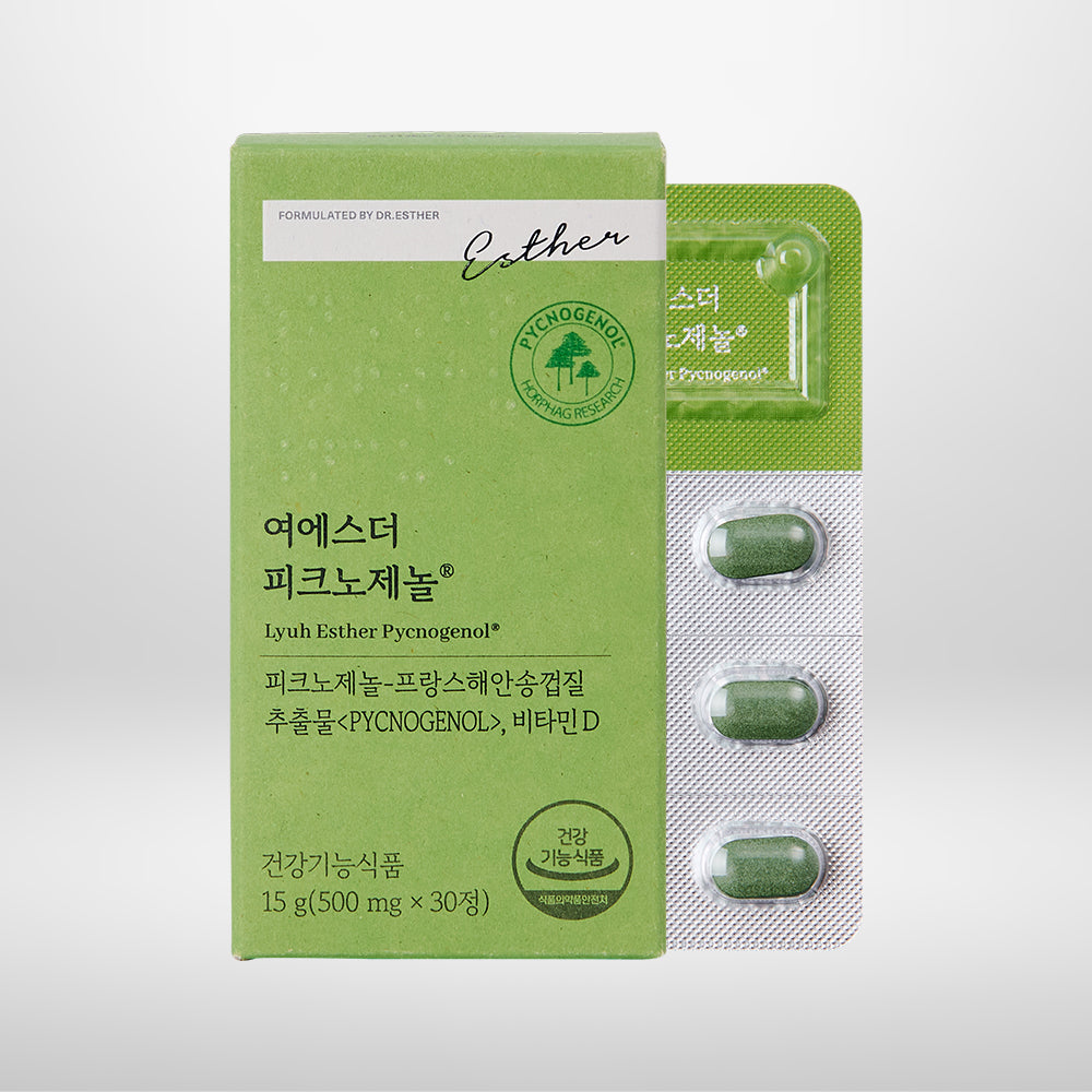 1)含有 100mg 碧萝芷,经韩国食品药品管理局 (MFDS) 单独认证(总原花青素 65mg) 2)混合了中年女性预防更年期症状所必需的多种成分 - 碧萝芷100mg,维生素D10μg为主要成分。 3)Lyuh Esther 博士的专业成分组合 4)每天一片,便捷呵护更年期女性健康 5)无添加剂 |